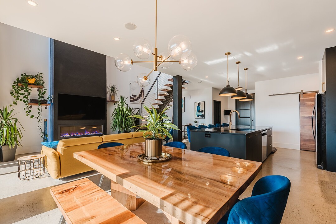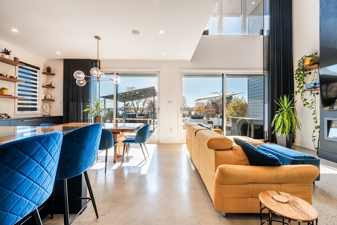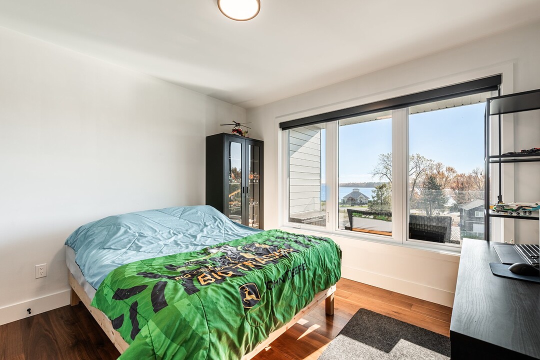 The open-concept main living area brings together the kitchen, dining room, and living room in a welcoming and light-filled space. The modern, functional kitchen features built-in speakers so you can enjoy your favorite music while cooking or entertaining guests. The living room stands out with its electric fireplace and impressive 18-foot cathedral ceiling, creating a warm and grand atmosphere. The abundant windows allow natural light to flood the space, offering peaceful views of the lake and surrounding nature.