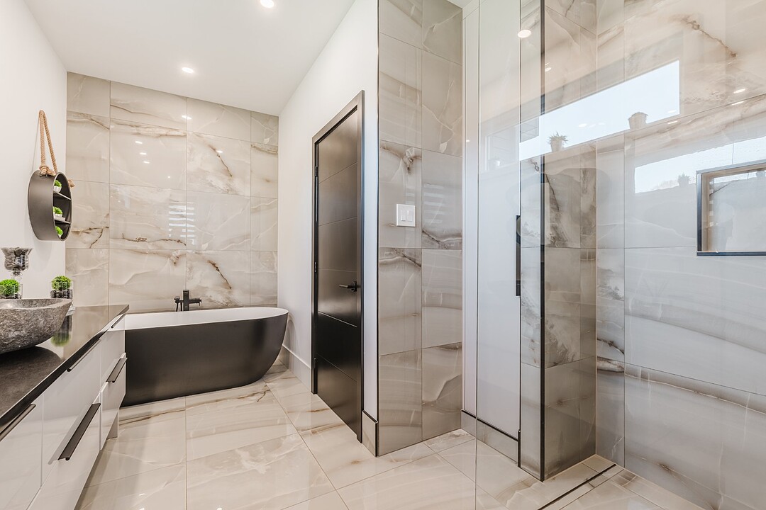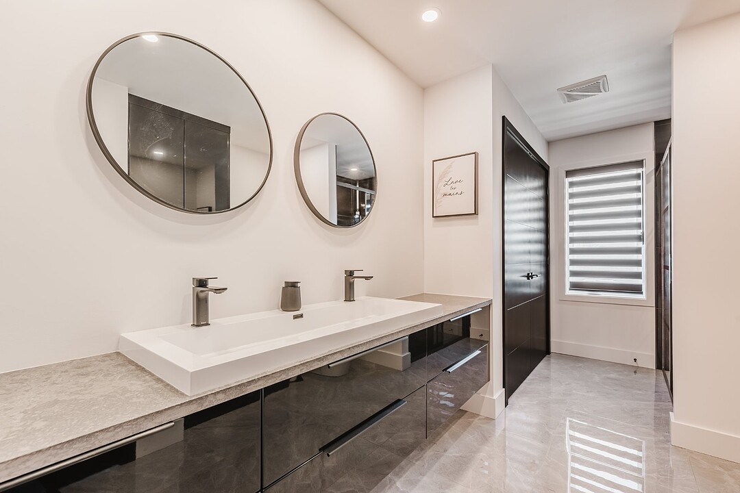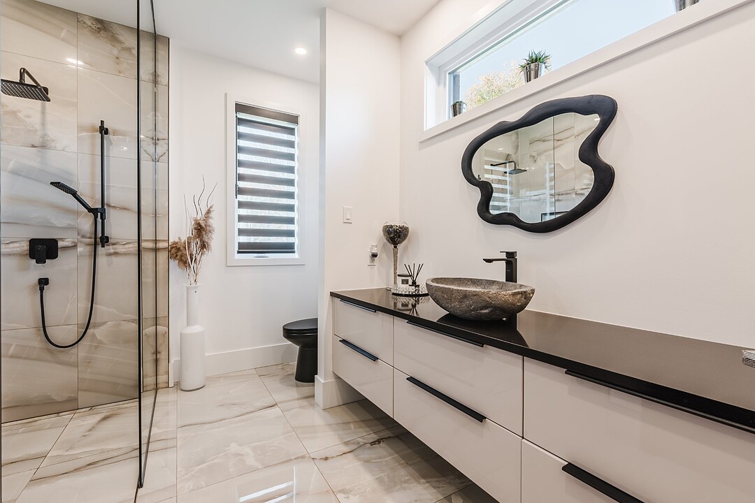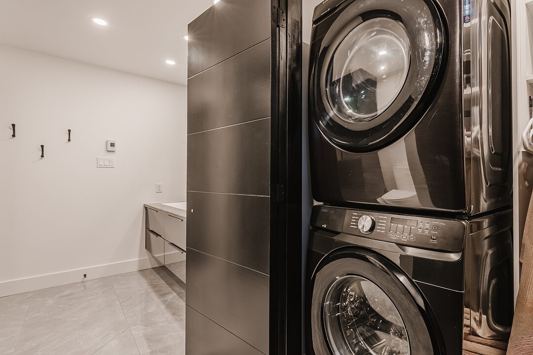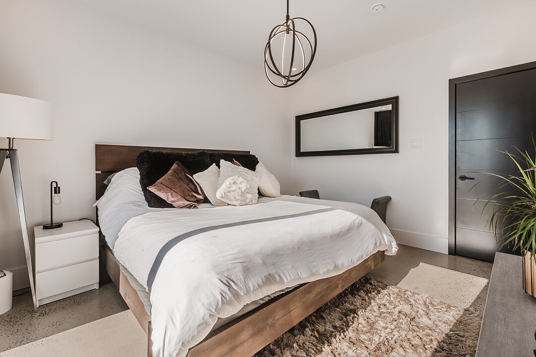 On the main floor, you'll find the primary bedroom -- a private and comfortable retreat with direct access to the bathroom. The bathroom features a sleek, minimalist design and ultimate comfort, while the bedroom includes a spacious walk-in closet for organized and discreet storage. Radiant floor heating ensures even, cozy warmth throughout the main level, making the home as inviting as it is luxurious.