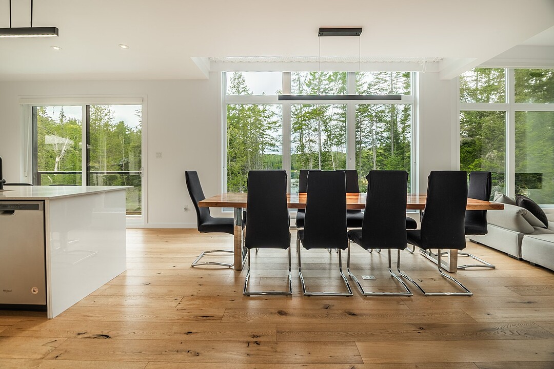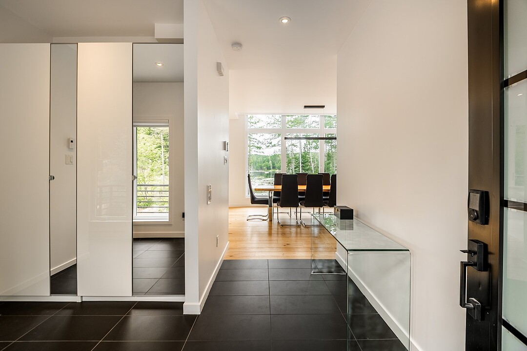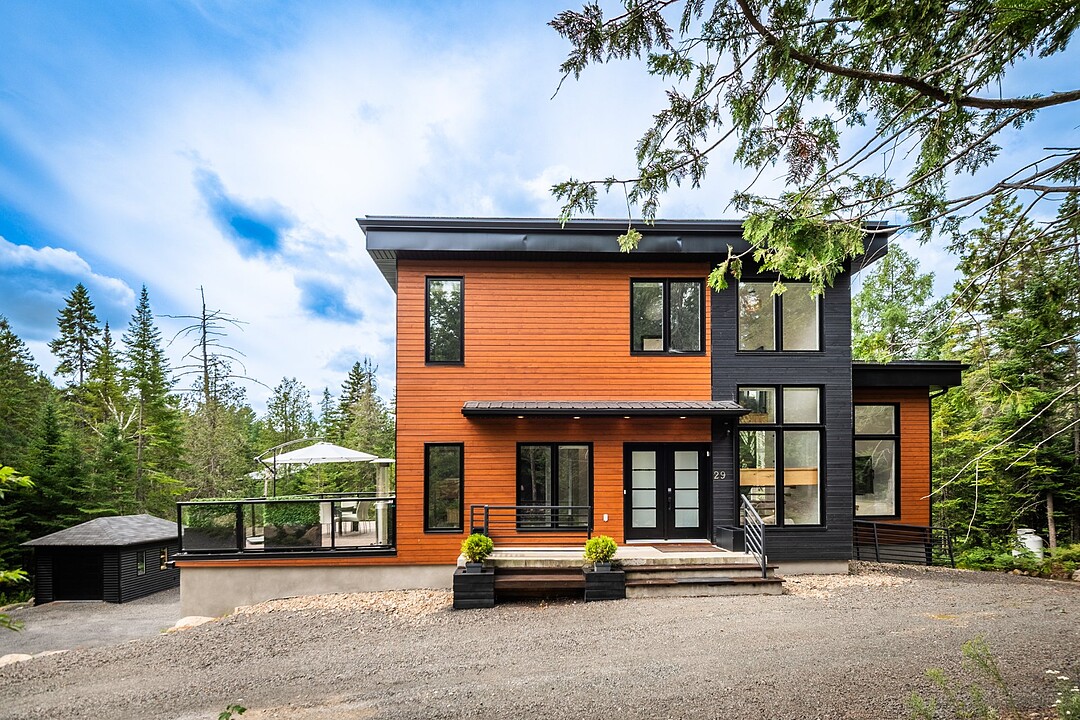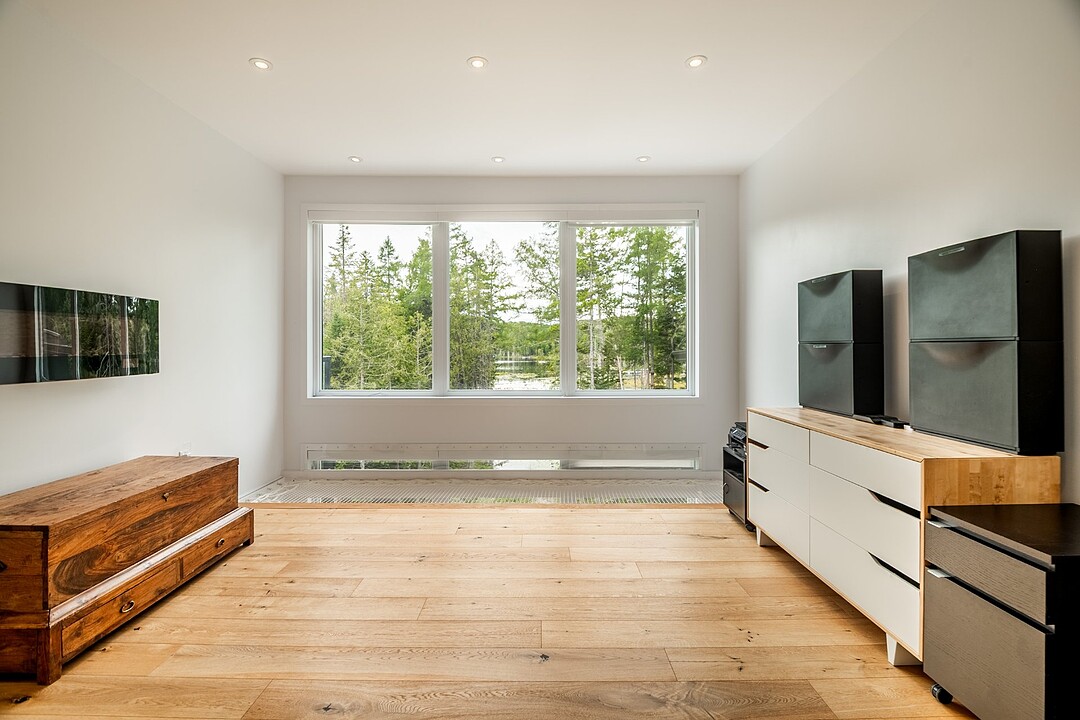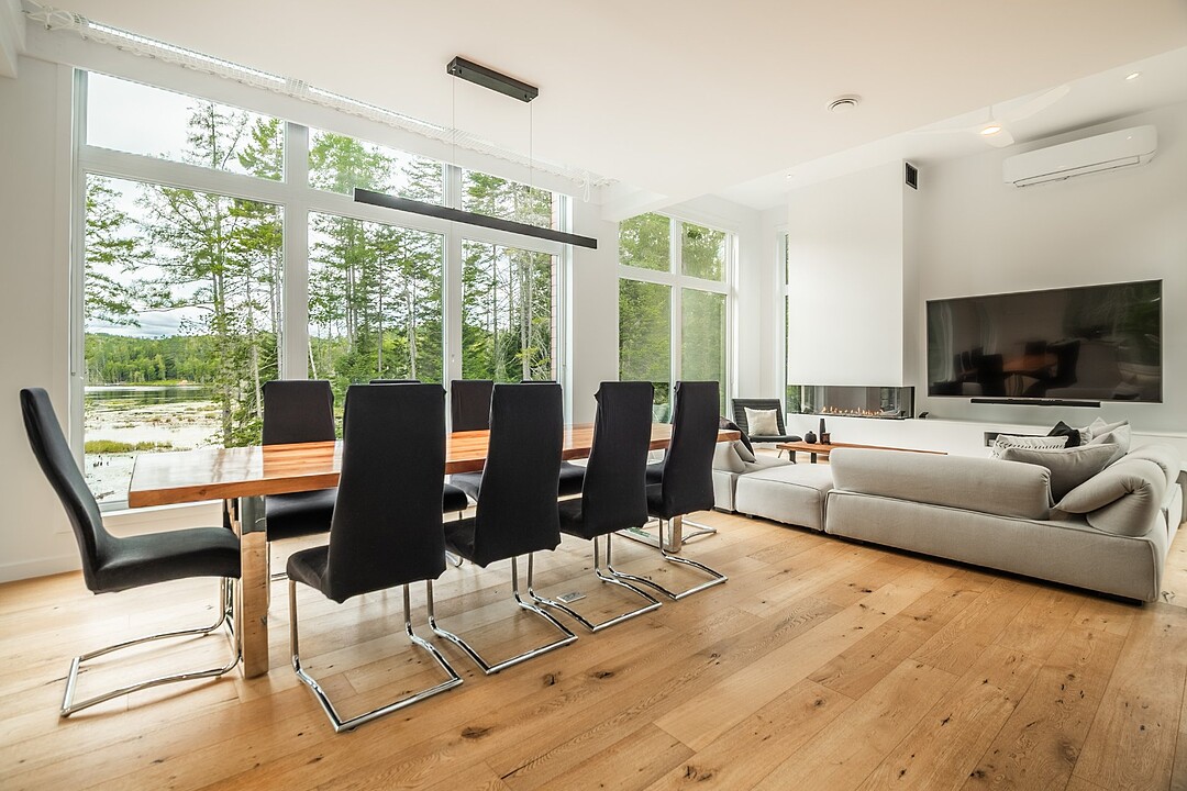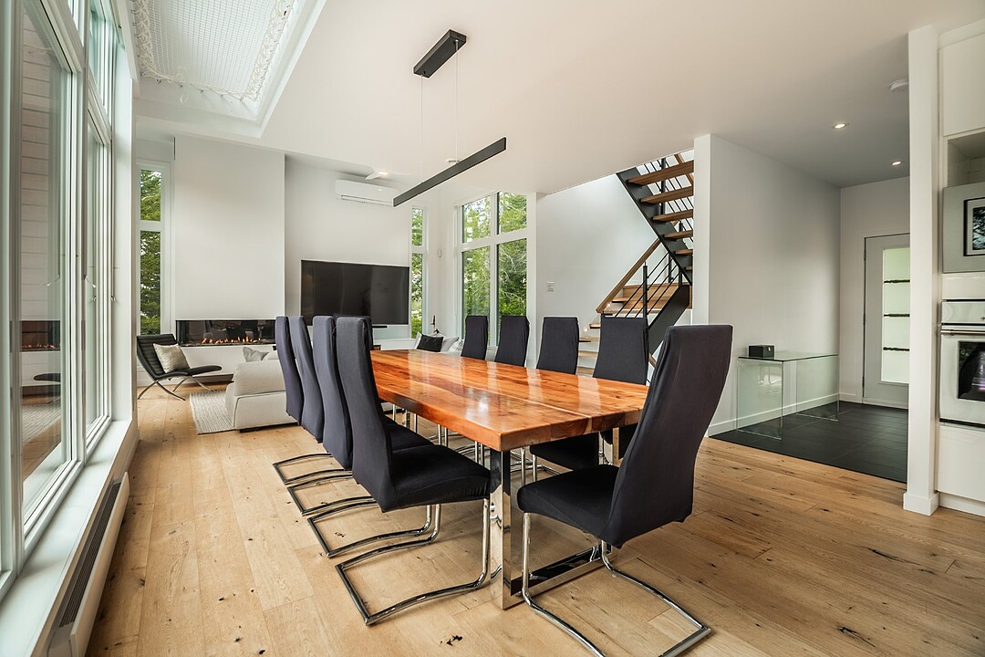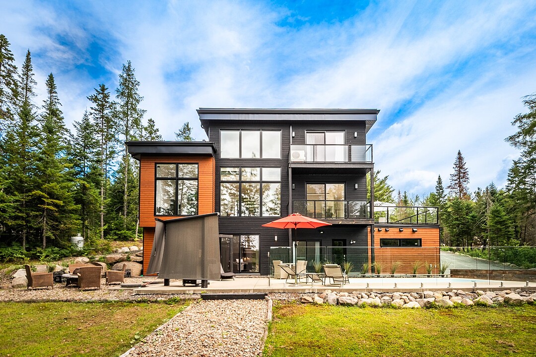 The layout of this property has been designed to follow the rhythm of nature. From the moment you step inside, Lake Piché reveals itself through expansive windows. To the left, a convenient powder room and a dog-wash station (perfect for muddy boots as well). To the right, the main living area. The kitchen stretches along the wall, offering an impressive work surface and a discreet walk-in pantry. Two patio doors open onto the terrace, where enjoying an aperitif quickly becomes a habit. The central dining area flows into the living room with a fireplace, creating a space that is open, warm, and well-structured. Upstairs, a versatile mezzanine with a suspended net overlooks the room below. The secluded primary bedroom features a private bathroom, walk-in closet, and an intimate balcony to watch the sunrise.