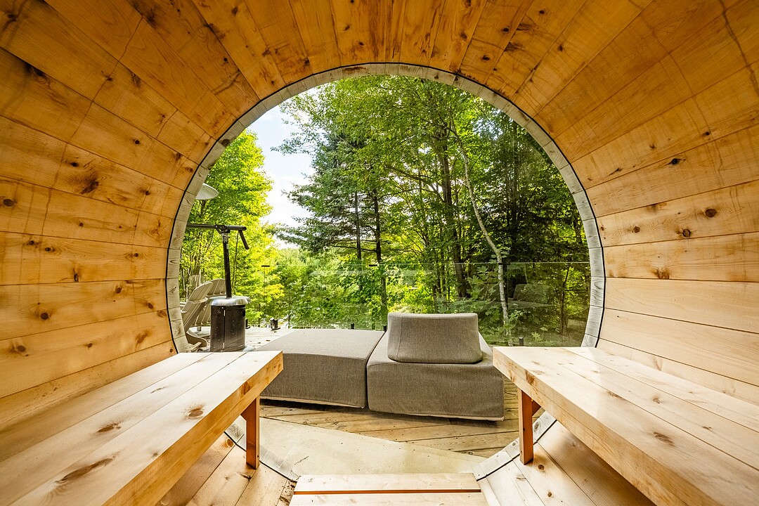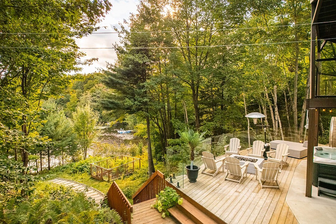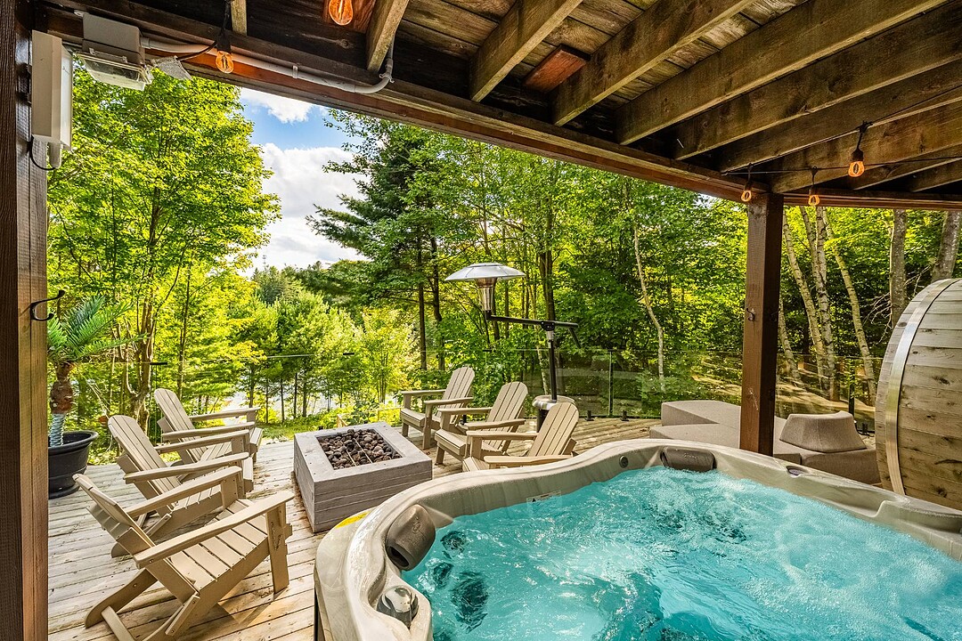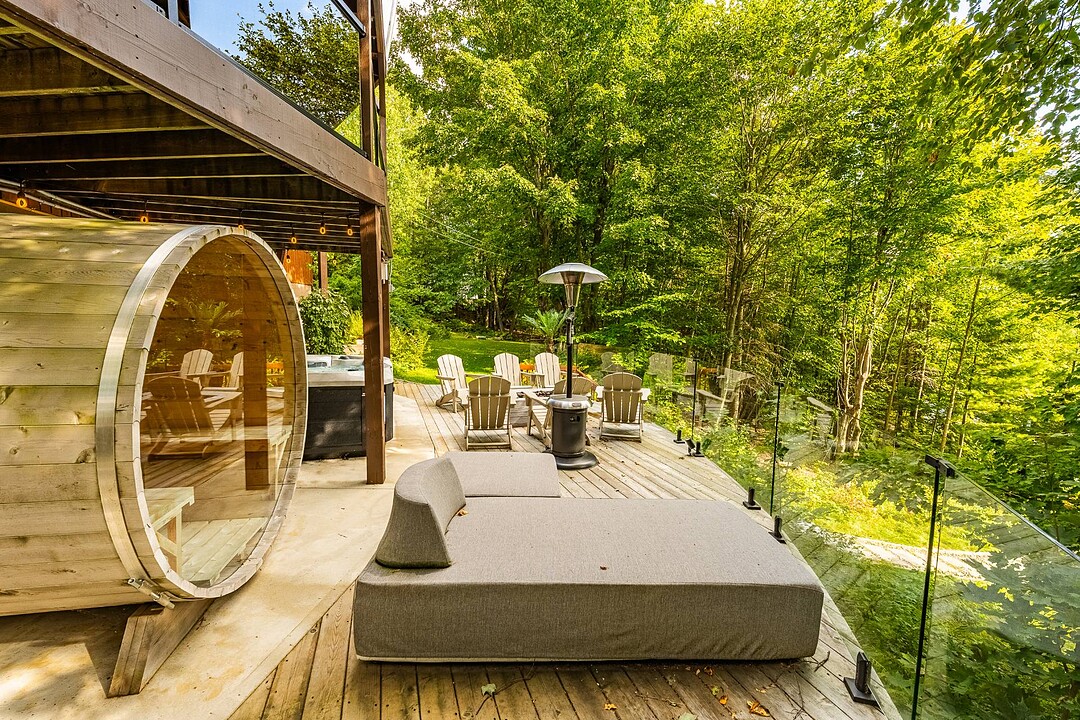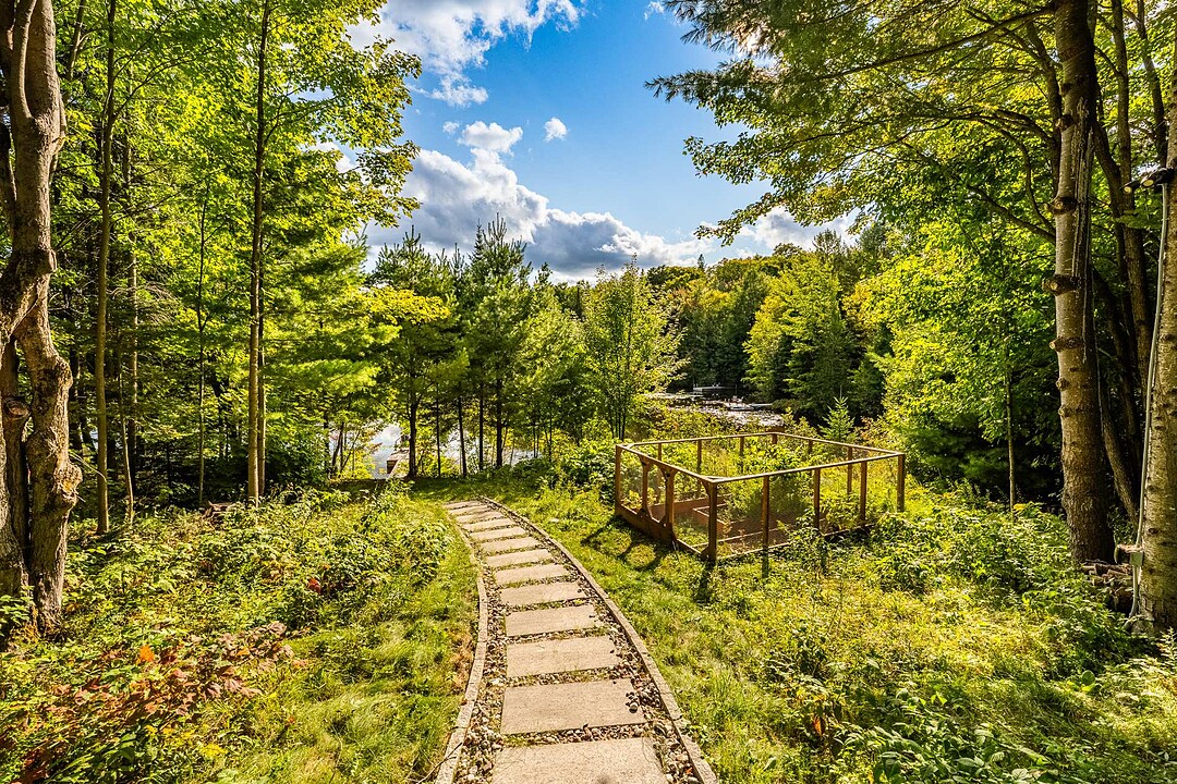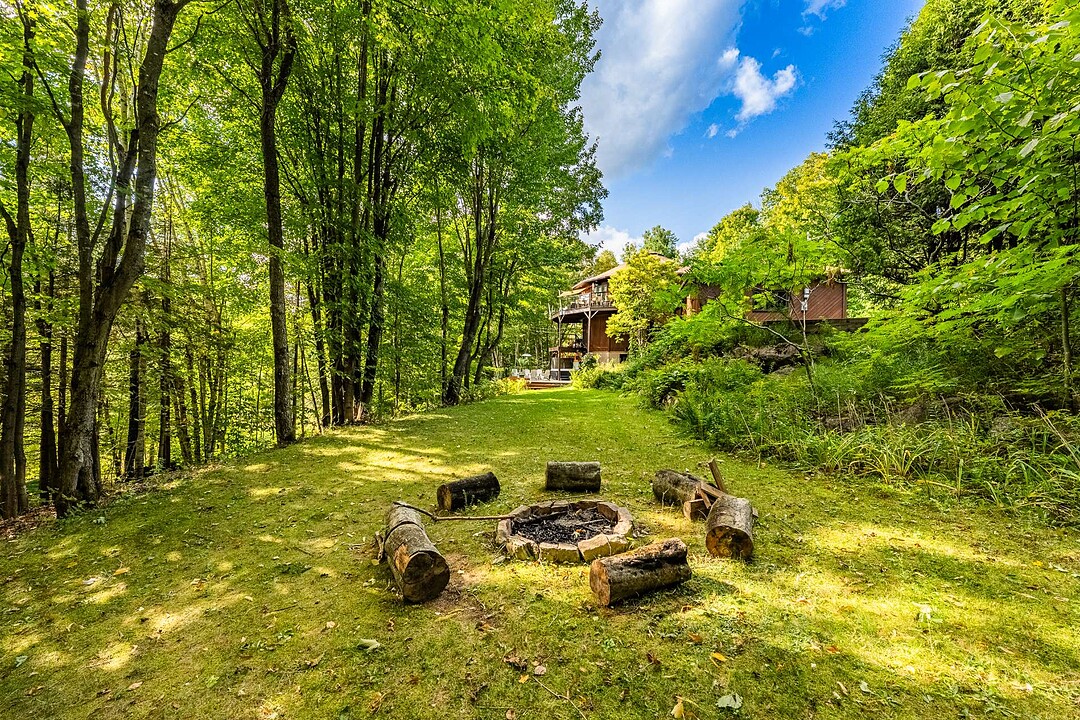 À l'extérieur, le terrain offre un aménagement paysager soigné de vivaces, assurant couleurs et textures tout au long de la saison. Un système pompe l'eau directement du lac pour arroser plates-bandes et jardins, simplifiant l'entretien tout en respectant la nature. Vous profiterez aussi d'une douche extérieure, de deux foyers (un au propane sur la terrasse oasis et un foyer au bois naturel dans le jardin), d'un abri de rangement, ainsi que d'un sauna, d'un spa et douche extérieur - parfaits pour une expérience après-ski ultime dans les Laurentides.