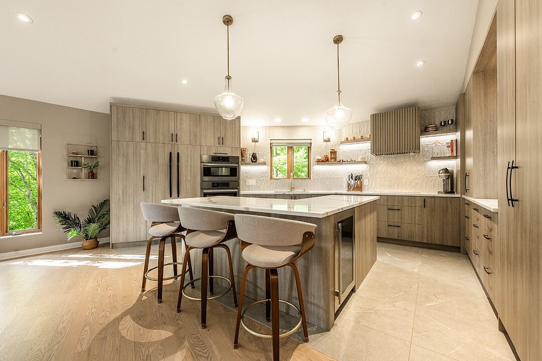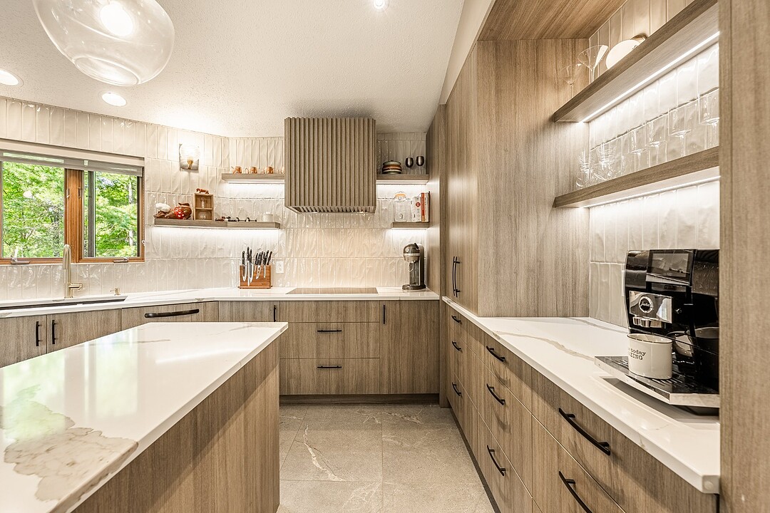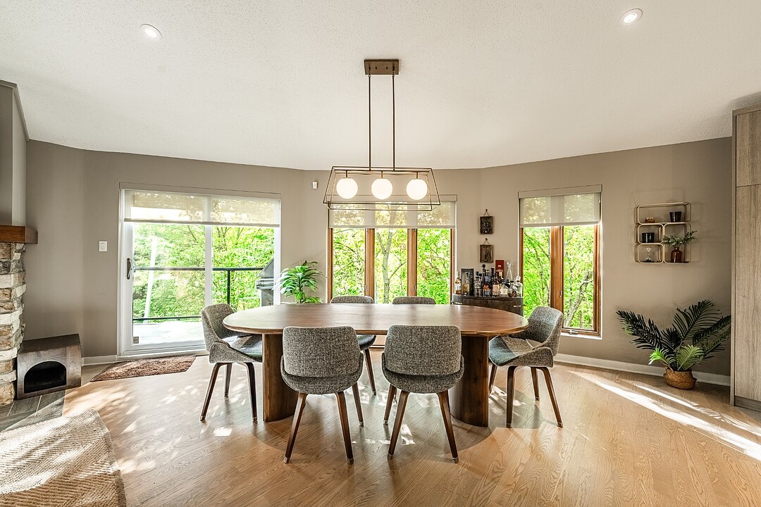 À l'étage, une aire ouverte baignée de lumière naturelle regroupe le salon, la salle à manger et la cuisine. Conçue par la designer Lyne Brunet, la cuisine se distingue par son esthétisme et sa fonctionnalité. Un foyer central au gaz magnifie le salon, tandis que le plafond cathédrale ajoute grandeur et chaleur, parfaits pour les rassemblements. De larges fenêtres offrent une vue imprenable sur le lac, transformant chaque journée en spectacle naturel.